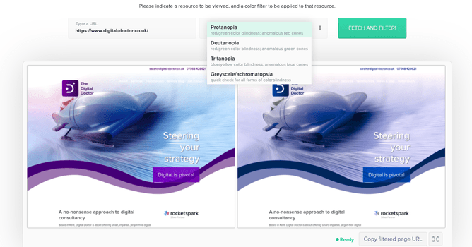 If you want to check out how your website is viewed by people who are colour blind, add your URL to Toptal and the software tool will generate images for you to compare the results depending on the colour filter selected (see the image below). The tool is still in development but looks promising as you can assess your site's accessibility early on in the design process.