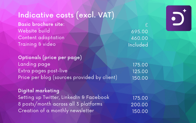 The monthly subscription rate starts at only £16.00 + VAT per month (an email address is extra at £3/month or you may opt for a business email hosted on Microsoft Exchange for £10/month).